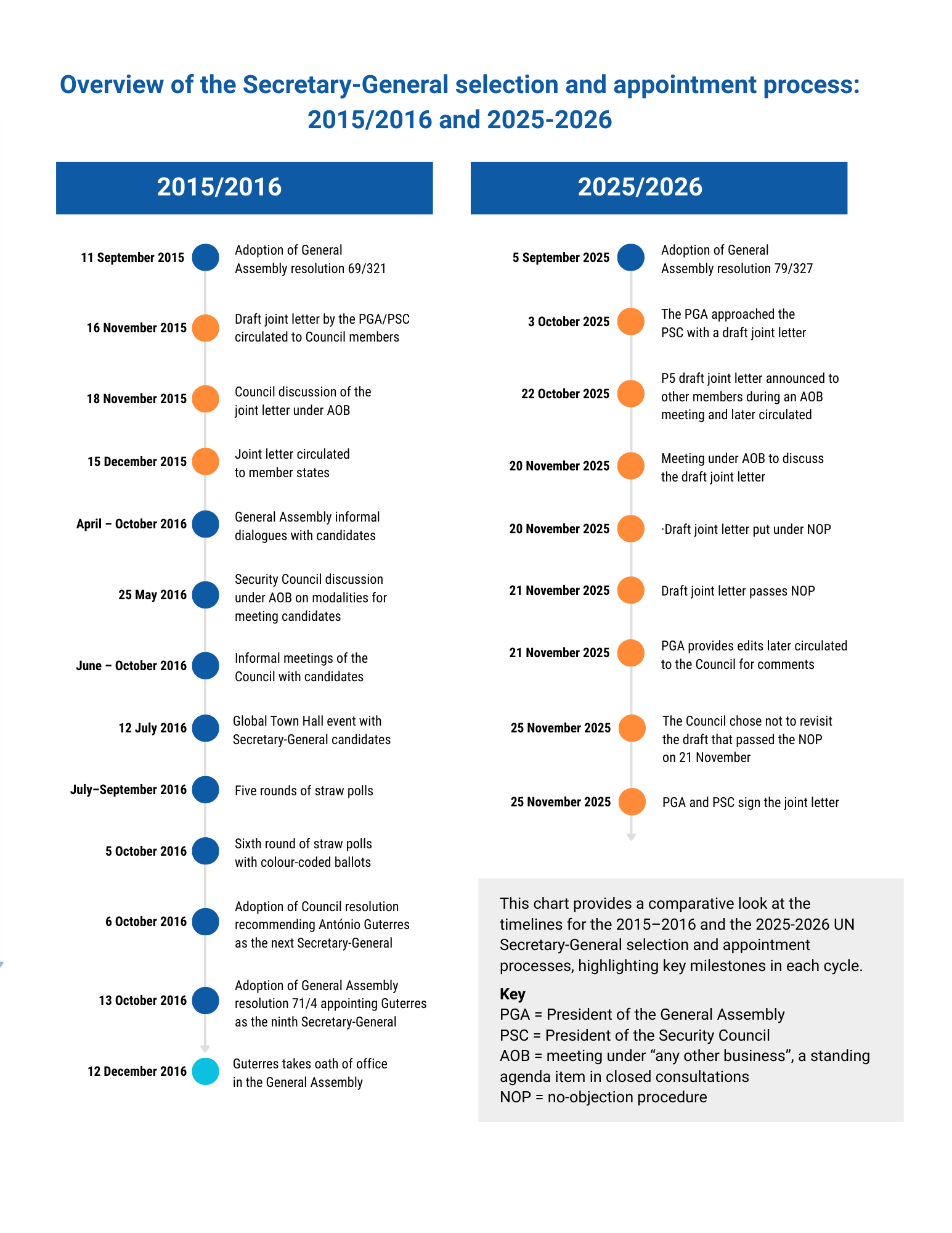In 2016, there was an attempt to appoint facilitators to consult with states on the substance of the appointment resolution, but some states raised concerns that this could be a divisive process. Some members are keen for the General Assembly to play a more active role, including through the possibility of its own straw polls, an idea that was included in the initial draft of resolution 79/327 but faced opposition from some members.